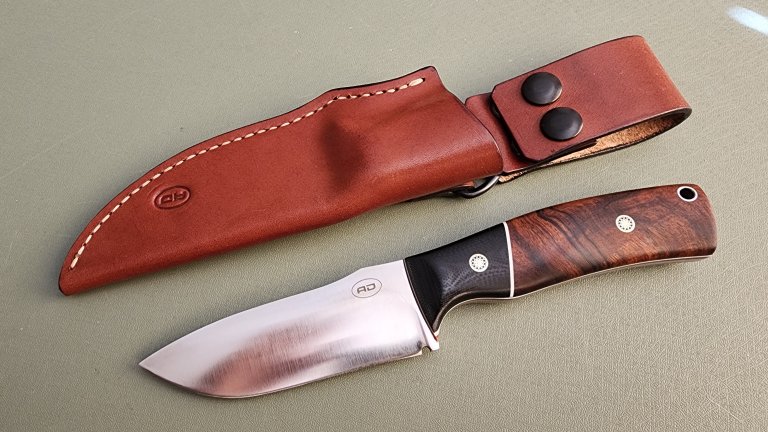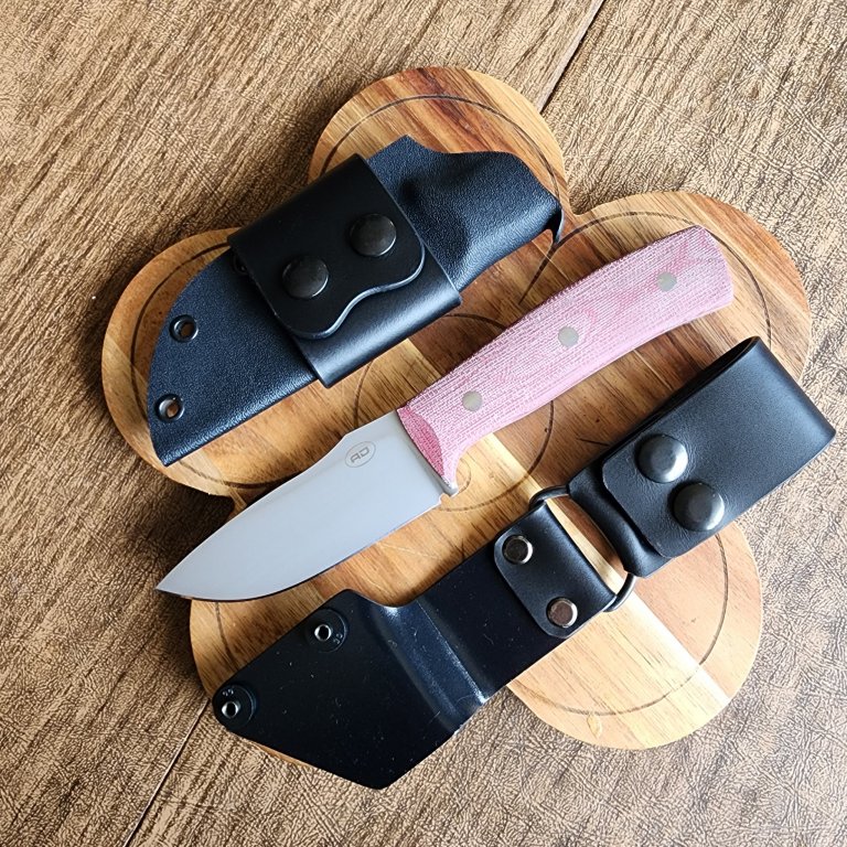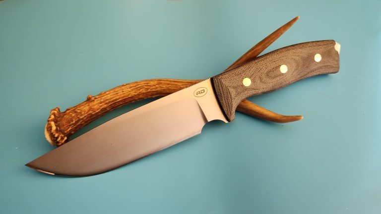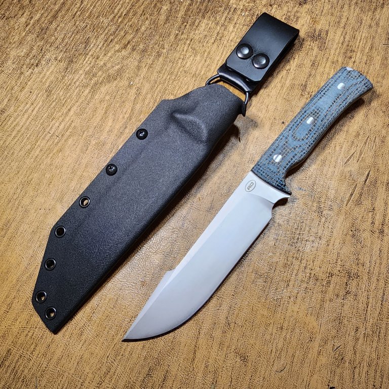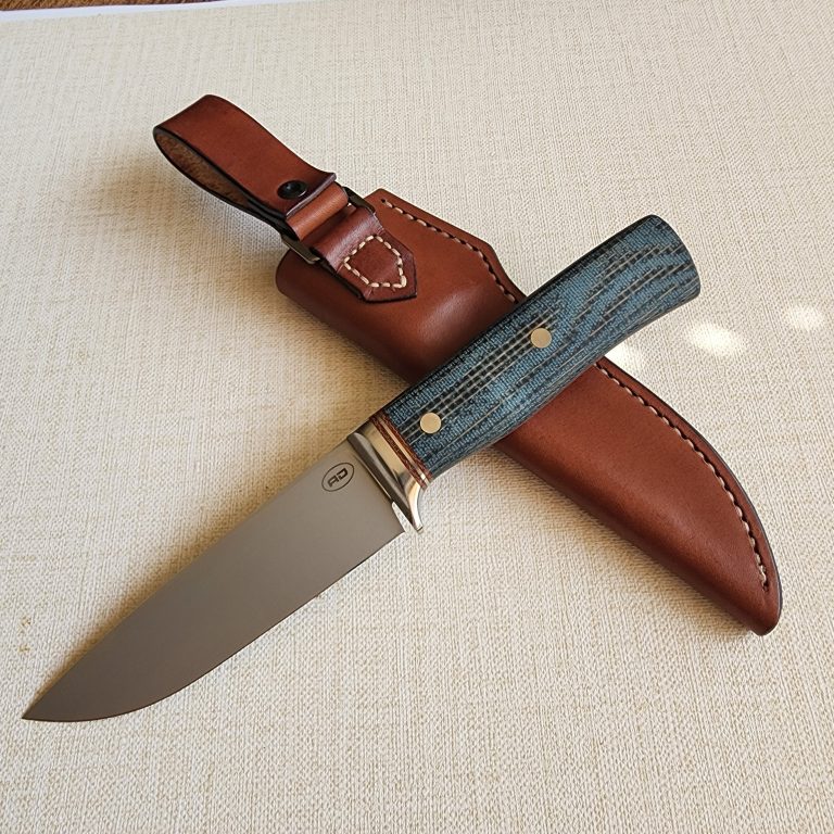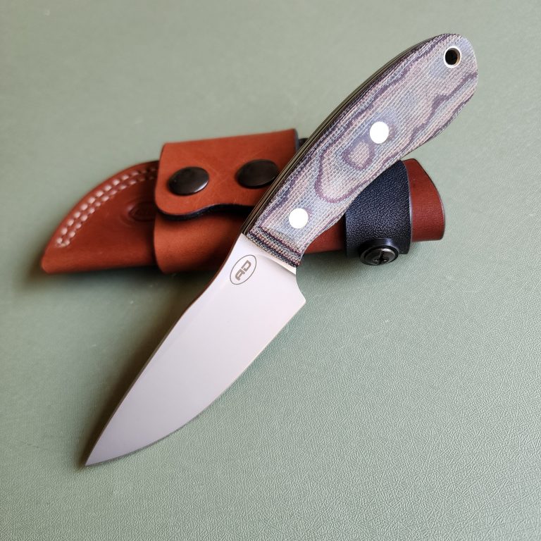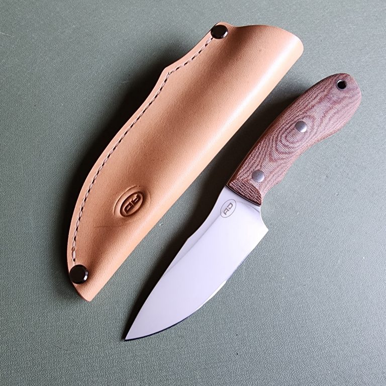 Magnacut 0.125″ 63RC 3.7″ blade, 7.4″ overall, 4 oz Natural canvas micarta Hermann Oak leather, natural tan
