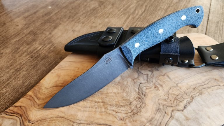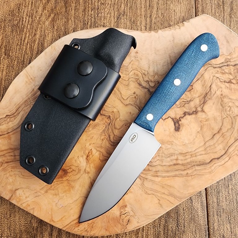 0.13″ Magnacut 63 RC 8.8″ overall 4.3″ blade 5.4 oz admiral blue jute micarta