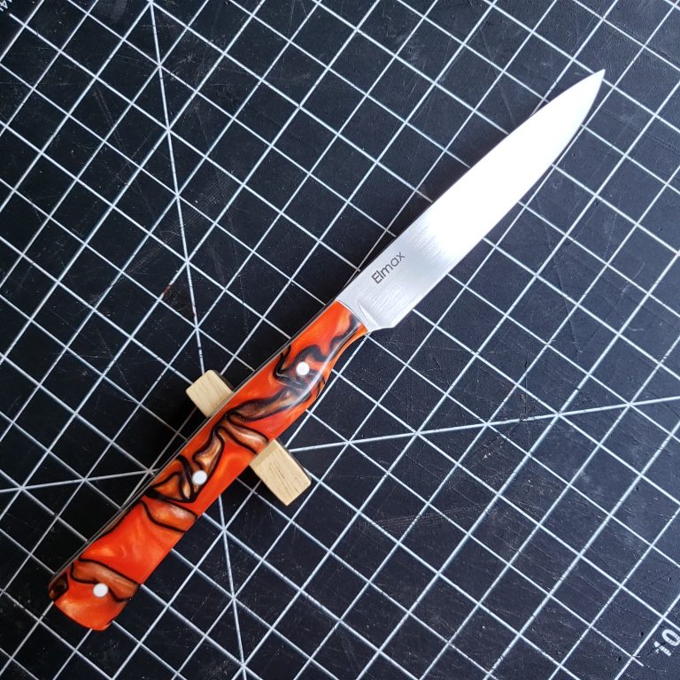 0.07″ Elmax 61RC 0.005″ behind the edge 7.5″ OAL, 3.5″ blade, 1.4 oz