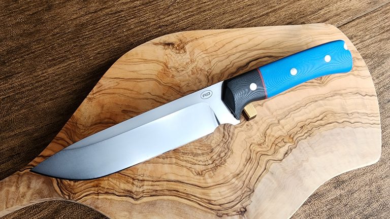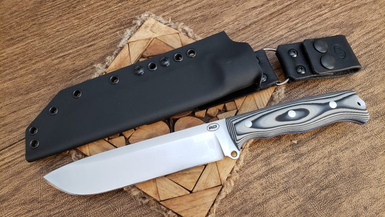 S45VN 0.175″ 61.5RC 12″ overall, 7″ blade, 11.3 oz (320 g) black canvas micarta, g10 liners, corby bolts, HO leather