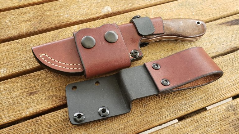 Magnacut 0.125″ 63RC 3.7″ blade, 7.4″ overall, 4 oz Natural canvas micarta Hermann Oak leather, natural tan