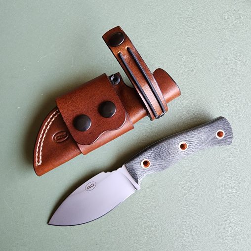 0.140″ Z-wear 61 RC 7.5″ OAL, 3.6″ blade, 4.4 oz tapered tang, black canvas micarta, G10 liners, SS corby bolts/tube Hermann Oak leather