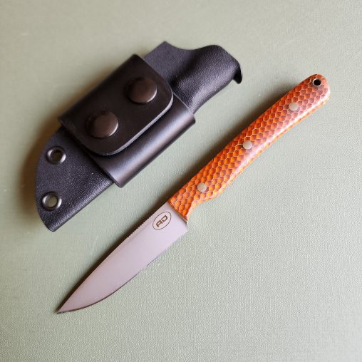 0.12″ 3V 60-61RC 7.3″ overall, 3.6″ blade 3.9 oz tapered tang burlap micarta, W&C leather