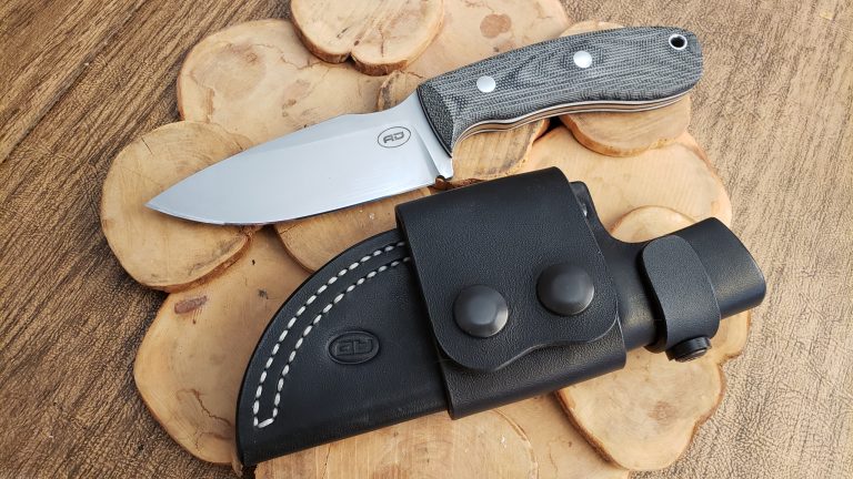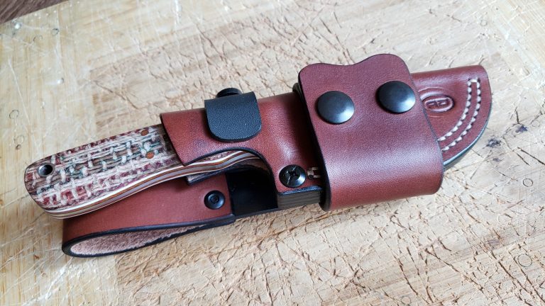 0.140″ Z-wear 61 RC 7.5″ OAL, 3.6″ blade, 4.4 oz tapered tang, black canvas micarta, G10 liners, SS corby bolts/tube Hermann Oak leather