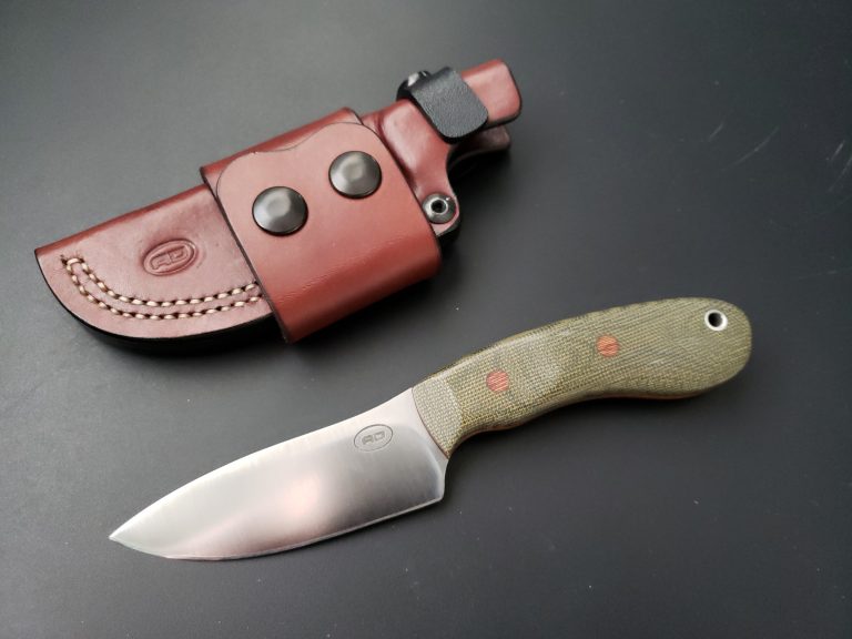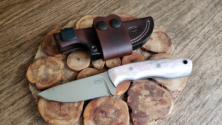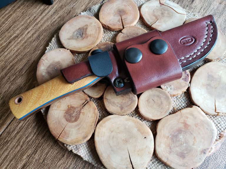0.125″ Z-wear 61.5 RC7.5″ OAL, 3.5″ blade, 4 ozHand applied satinCamel bone scalesHermann Oak leather , DOT fasteners