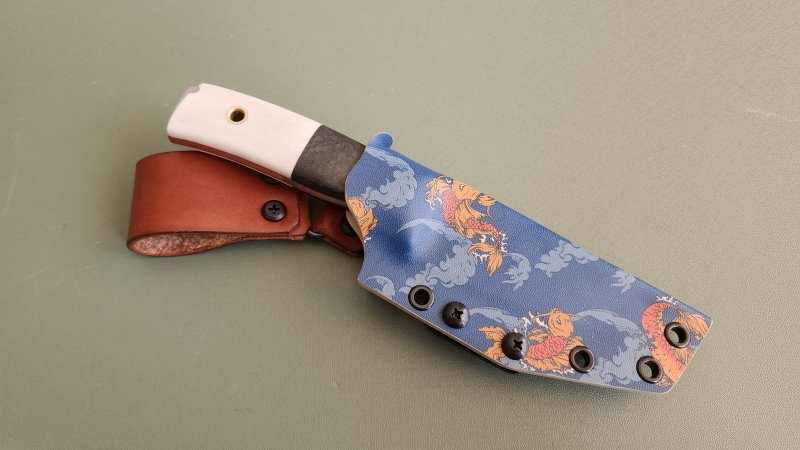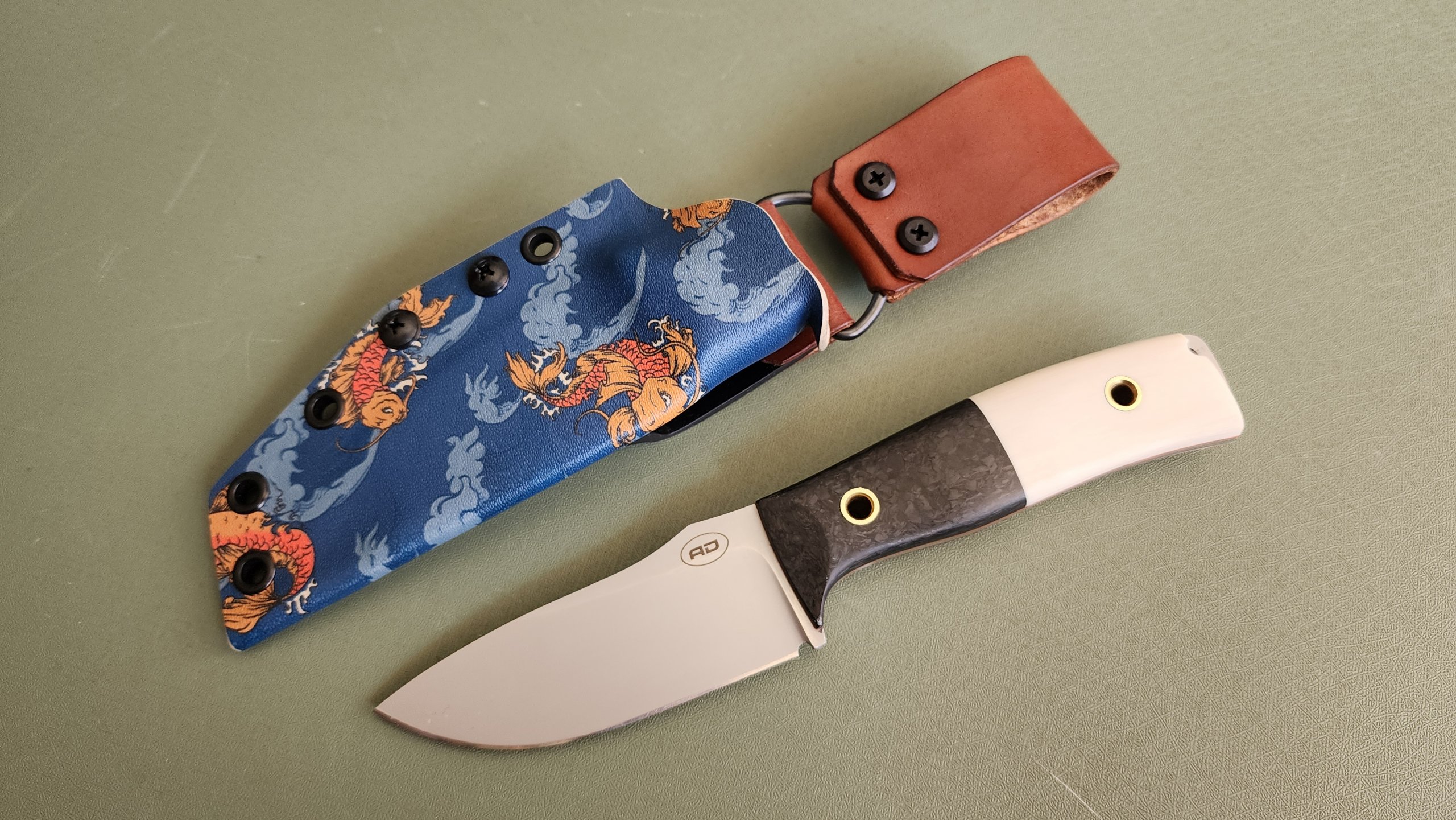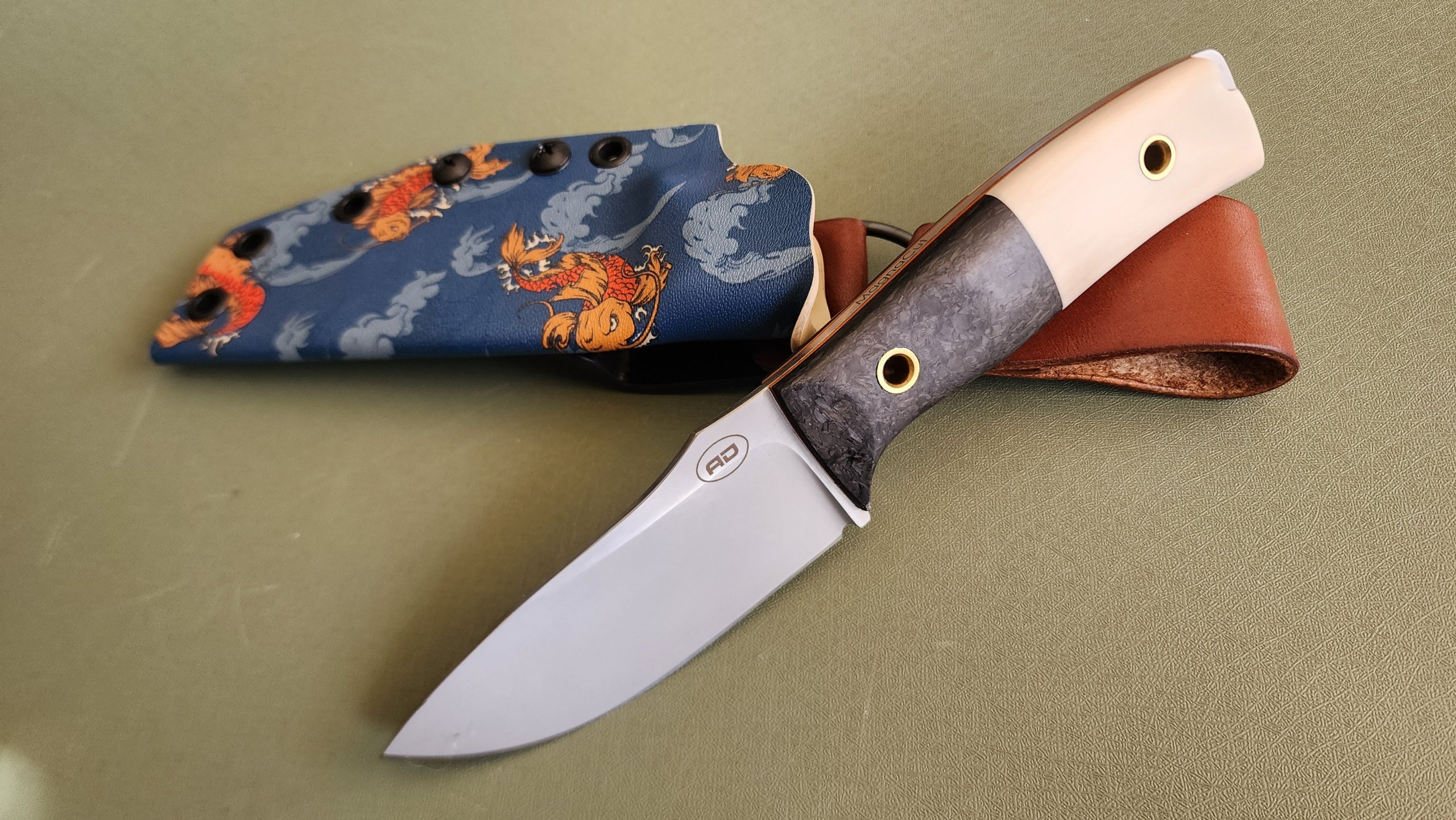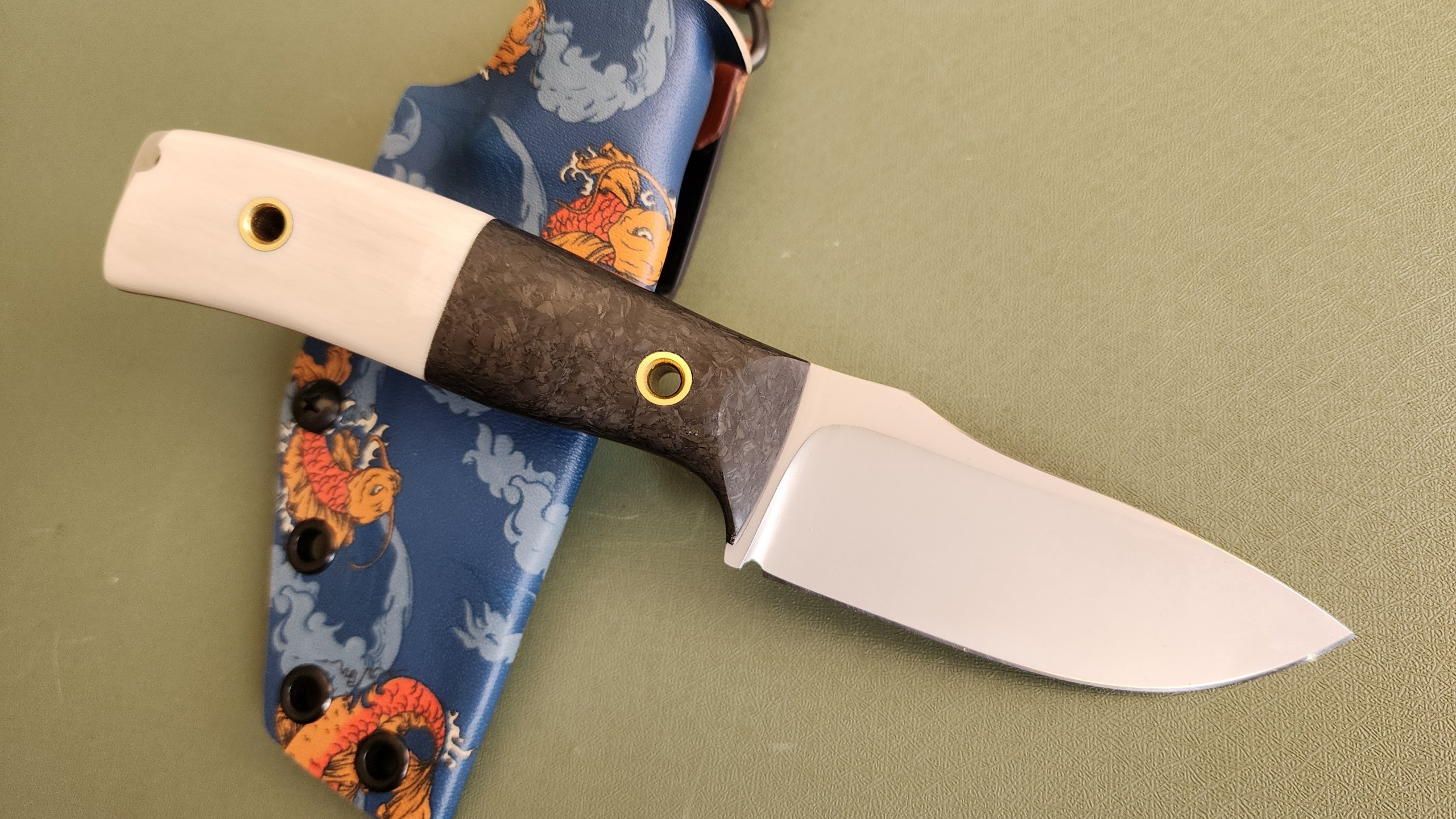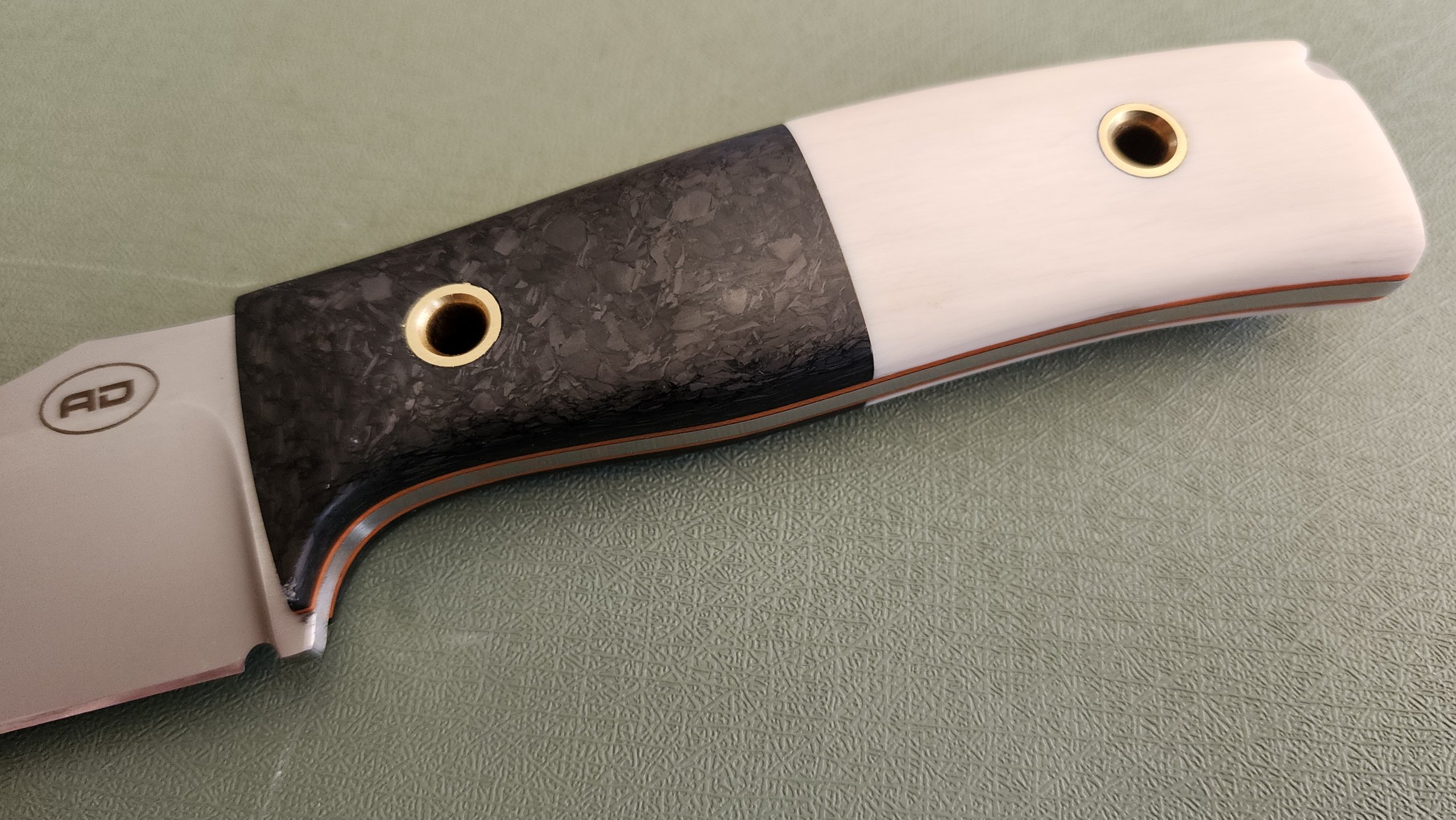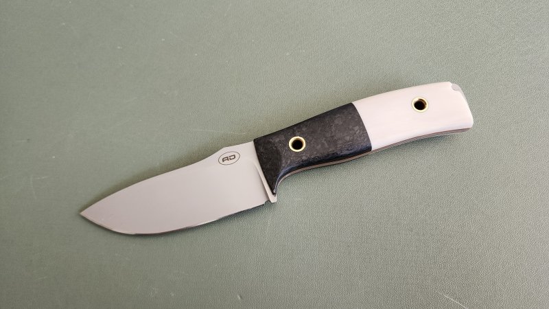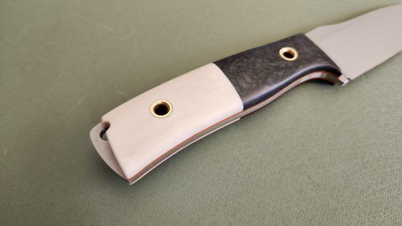 DP35 in CF/ivoryavdronFebruary 23, 2026jfield, Midsize knives 0.13″ Magnacut 63RC 8.25″ overall, 3.6″ blade, 5.2 oz Forged CF / super tusk ivory / brass tubes