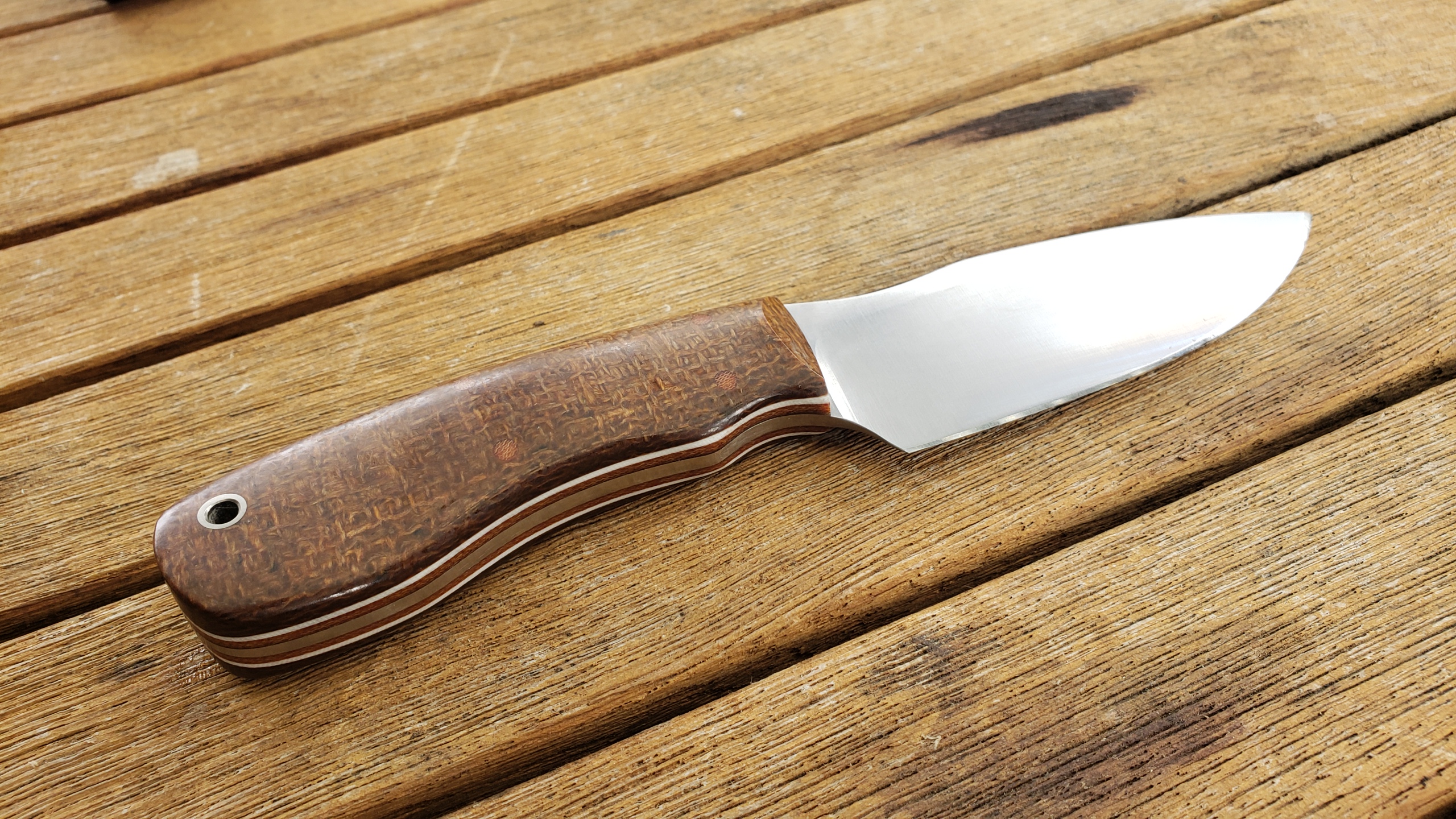 H35 burlap/3v 0.12″ 3V 60-61RC 7.3″ overall, 3.6″ blade 3.9 oz tapered tang burlap micarta, W&C leather December 4, 2021 In h3, Small EDC ← Previous post Next post →
