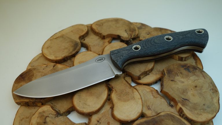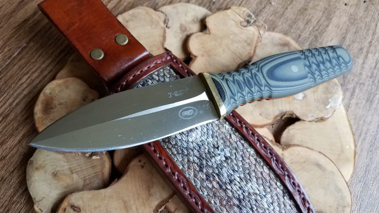 3V 0.17″, cryo treated, low end tempered to 60-61RC 9″ OAL. 4.25″ blade 7 oz G10, steel corby bolts, leather 3V tempered in lower end (400F) for better corrosion resistance. Sheath is ambidextrous. Retention strap can be unscrewed and rotated…