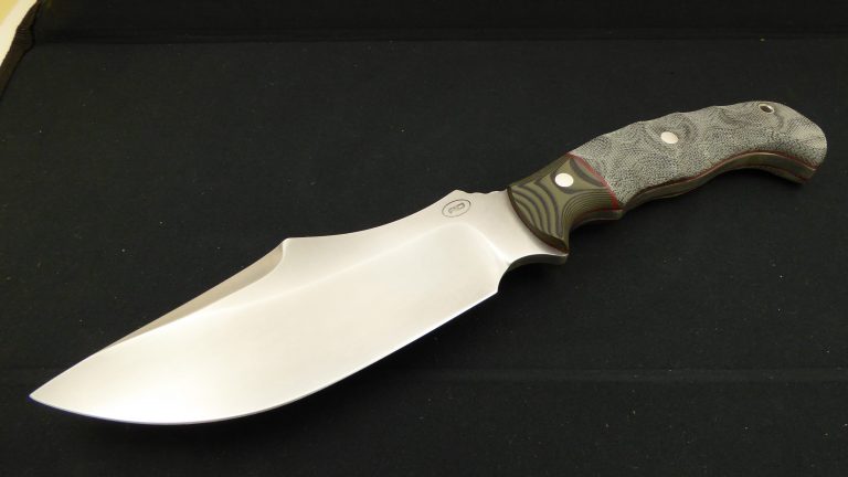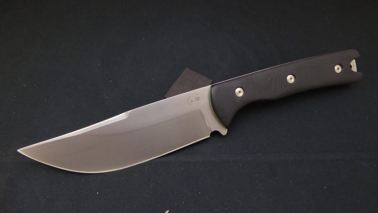 0.215″ SpectrumWear 60RC cryo treated, triple tempered O.A.L 11.5″, blade 6.25″, 2″ max. wide , 14 oz G10, black canvas micarta Handle design courtesy by Jay Ghoo