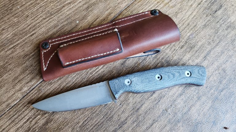 0.12″ 3V 60-61RC 7.3″ overall, 3.6″ blade 3.9 oz tapered tang burlap micarta, W&C leather